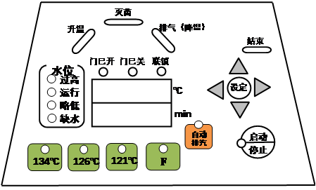 1﹚ 升温灯:当进入灭菌周期,升温灯轮流闪烁,进入灭菌时段该灯灭;